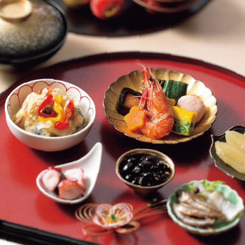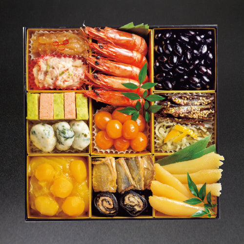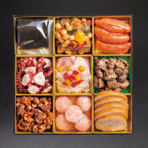 ・中華クラゲ ・花咲イカサラダ ・境港紅ズワイと枝豆のふくさ ・国産若竹つみれのあんかけ ・九州産紅はるか入り栗きんとん ・祝いエビ ・完熟金柑 ・にしん湯葉巻き ・黒豚昆布巻き ・国産黒豆 黒糖風味 ・わかさぎ田作り ・なます柚子昆布 ・味付き数の子