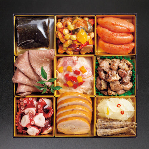 ・十六島のり入り磯煮 ・ローストビーフ ・北海道産酢だこ ・彩り野菜のラタトゥイユ ・ハムマリネ レモン風味 ・華味鳥 マスタード風味 ・博多辛子明太子 ・おさつポークの炭火焼 ・甘酢大根 ・めひかり南蛮