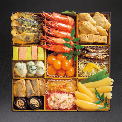 ・銀だらみそ焼き ・堺港紅ズワイと枝豆のふくさ ・国産若竹つみれのあんかけ ・にしん湯葉巻き ・黒豚昆布巻 ・祝い海老 ・完熟金柑 ・中華クラゲ ・花咲イカサラダ ・鱧西京焼き ・あなご東寺巻 ・わかさぎ田作り ・なます柚子昆布 ・味付き数の子